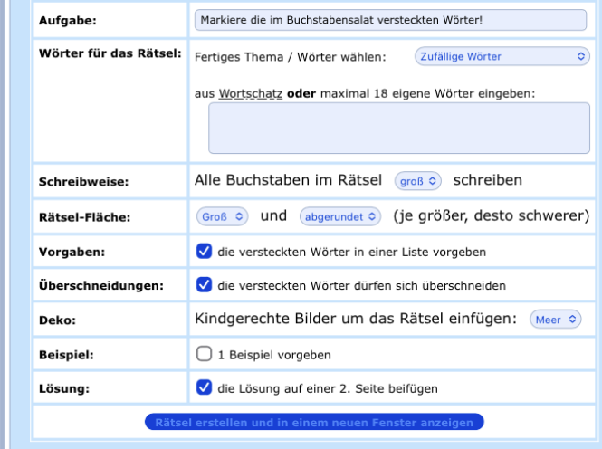 In einem Durcheinander von Buchstaben werden versteckte Wörter gesucht. Wörter, Größe und Form der Kinderrätsel sind auswählbar (je größer die Fläche, desto schwerer das Rätsel).