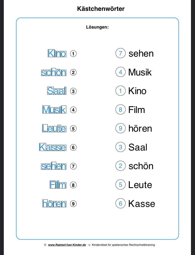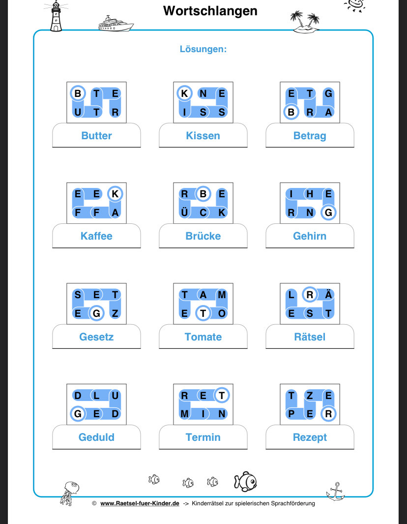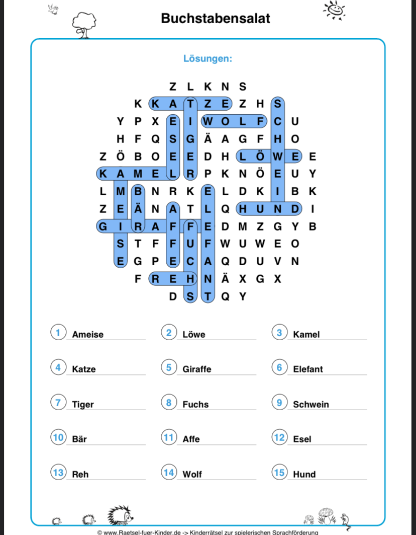 Hier lassen sich kostenlos Rätsel für Kinder ab 7 Jahre / Schüler ab Klasse 2 mit Lösung abrufen und auch nach eigenen Wünschen erstellen. Es steht ein Wortschatz von über 1400 Wörtern zur Verfügung, der sich an Grundschüler orientiert. Daraus werden je nach Kinderrätsel bestimmte Wörter ausgesucht (Wortart, Wortlänge, Silben…), um damit per Zufallsgenerator immer wieder neue Rätsel zum Ausdrucken erzeugen zu können.